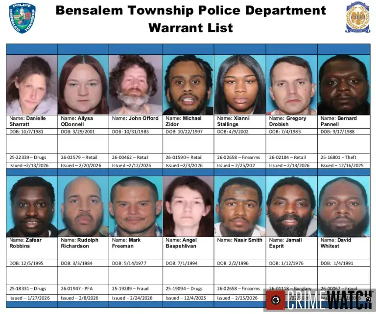 View the full warrant list with photos and specific charges on the Bensalem Police Crimewatch page.